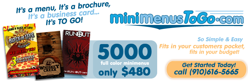 To get started, just give us a call at (910)616-5665 or send us an email and a representative will contact you. Based on the information you supply us with, a professional graphic designer will design a custom mini-menu just for you!