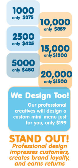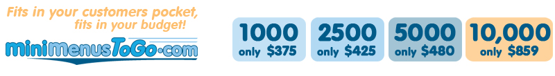 Traditonal to-go menus are big and bulky. Your customers have to fold them, wrinkle them, and find a place to store them. Now, with mini-menus, your customers can easily take home a full color, attractive version of your menu. And it's only slightly bigger than a business card when folded. But when opened, its a full 4x10 inches, printed on both sides in beautiful full glossy color